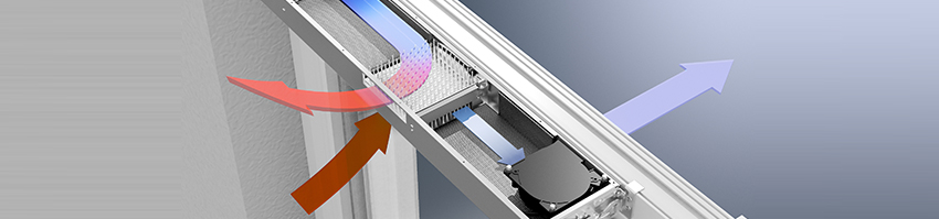 I dispositivi di ventilazione Schüco VentoTherm, integrati nelle finestre, sono una soluzione altamente efficiente per la ventilazione decentralizzata con recupero di calore. Con VentoTherm, l’aria viziata proveniente dall’interno dell’edificio attraversa un dispositivo di recupero che, prima di trasferirla all’esterno, ne assorbe il calore. Al contempo l’aria fredda proveniente dall’esterno dell’edificio, passando attraverso lo stesso dispositivo, viene filtrata e preriscaldata con il calore recuperato dall’aria interna espulsa, ottenendo la massima efficienza energetica e un elevato comfort abitativo.